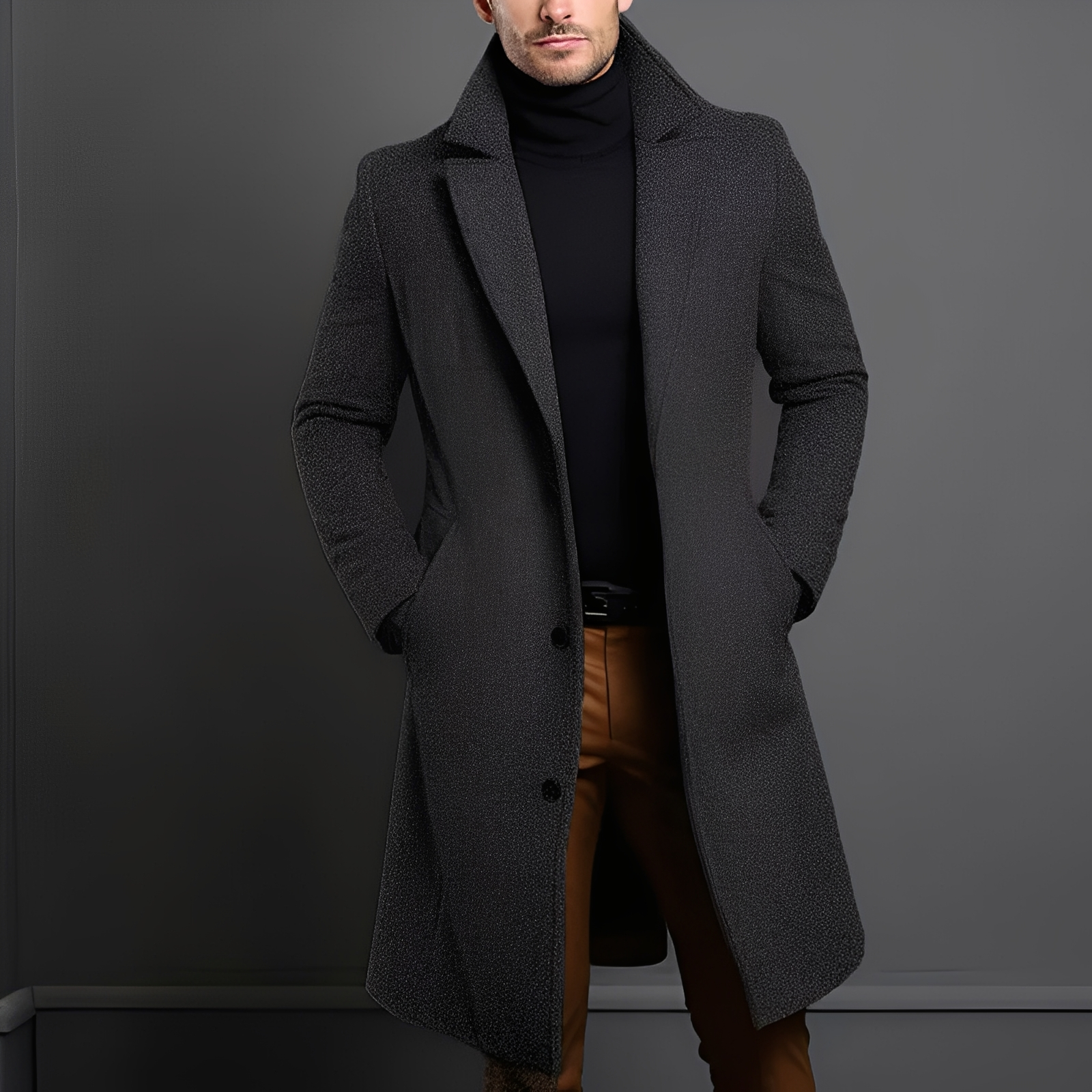 Kristopher ist ein traditioneller Herren-Trenchcoat aus hochwertigem Wollstoff, der Stil und Funktion wunderbar kombiniert. Der mittlere Schnitt sorgt für eine schmeichelnde Passform und hält zuverlässig warm – ideal für Herbst und Winter. Mit seinem zeitlosen Design passt der Mantel sowohl zu eleganten Outfits als auch zu legeren Looks. Der Reverskragen, die Knöpfe und die seitlichen Taschen verleihen einen maskulinen, stilvollen Look. Ein Mantel, der in keinem Herrenkleiderschrank fehlen sollte.